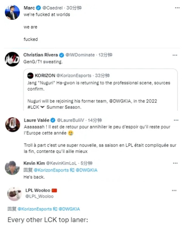 得知牛宝回来的消息,各位解说、主持人纷纷发表自己看法。解说Caedrel称:LEC赛区又要遭重了。退役选手IWDominate称:T1和GEN这下该颤抖了!LEC主持人Laure称:他要回来了,回来摧毁我们仅剩的一丁点希望。不过抛开这些,他回来应该挺开心的,据说他在LPL的一年过得不算好。电竞记者Kevin晒牛宝背影图感慨:他回来了。