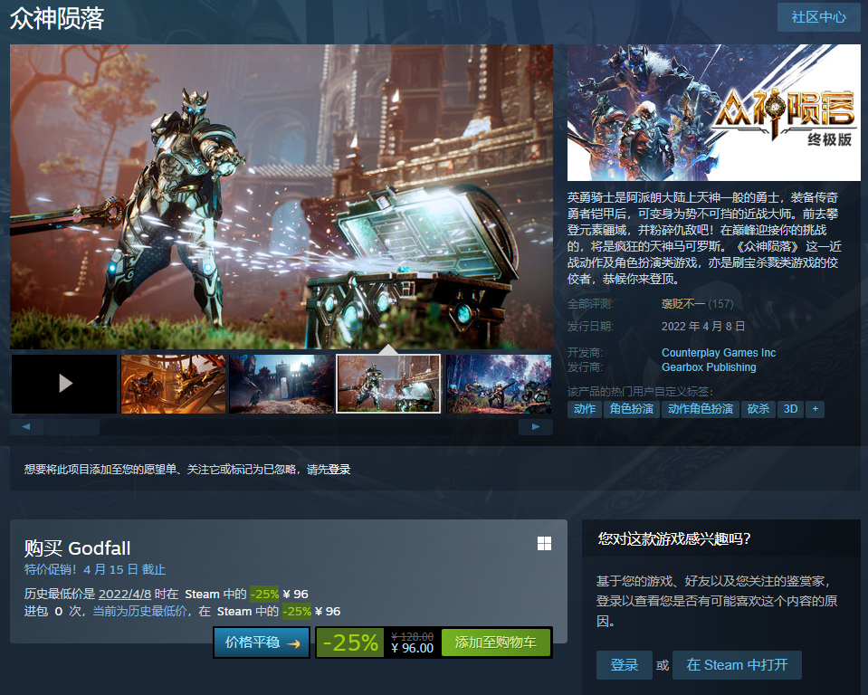《众神陨落》在长时间的EPIC独占之后,终于上线steam平台,首发及打折,目前75折后96元,原价128元。
