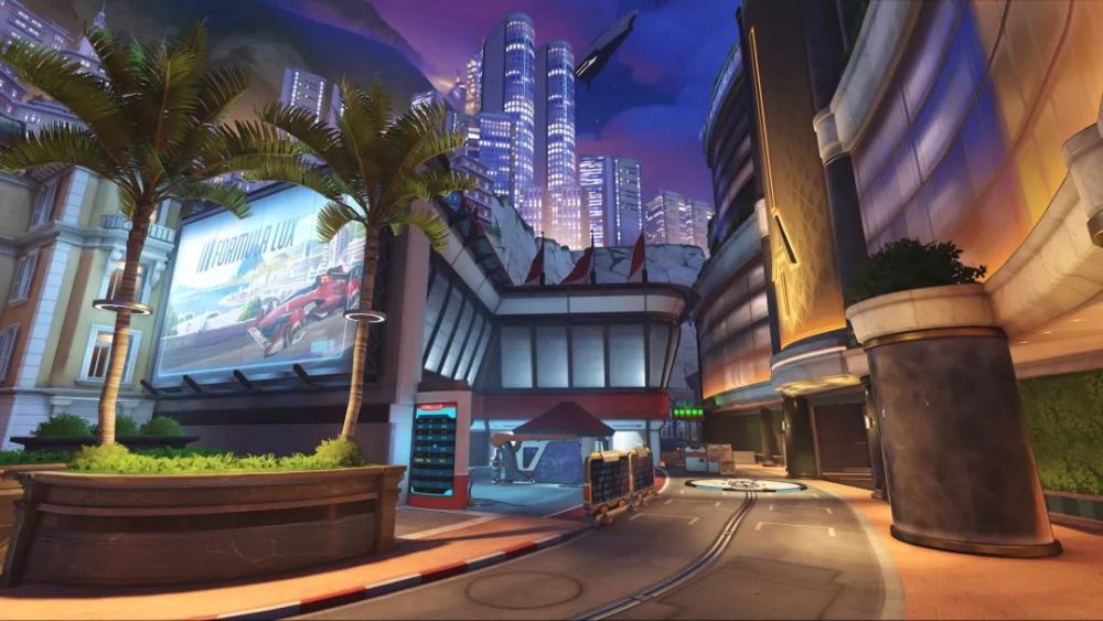 你也许还会在其他游戏模式中发现这种开发策略;全新的运载目标地图皇家赛道,以及攻击/护送地图中城,两张地图都巧妙地运用环境设计,用视觉效果指引玩家行动。