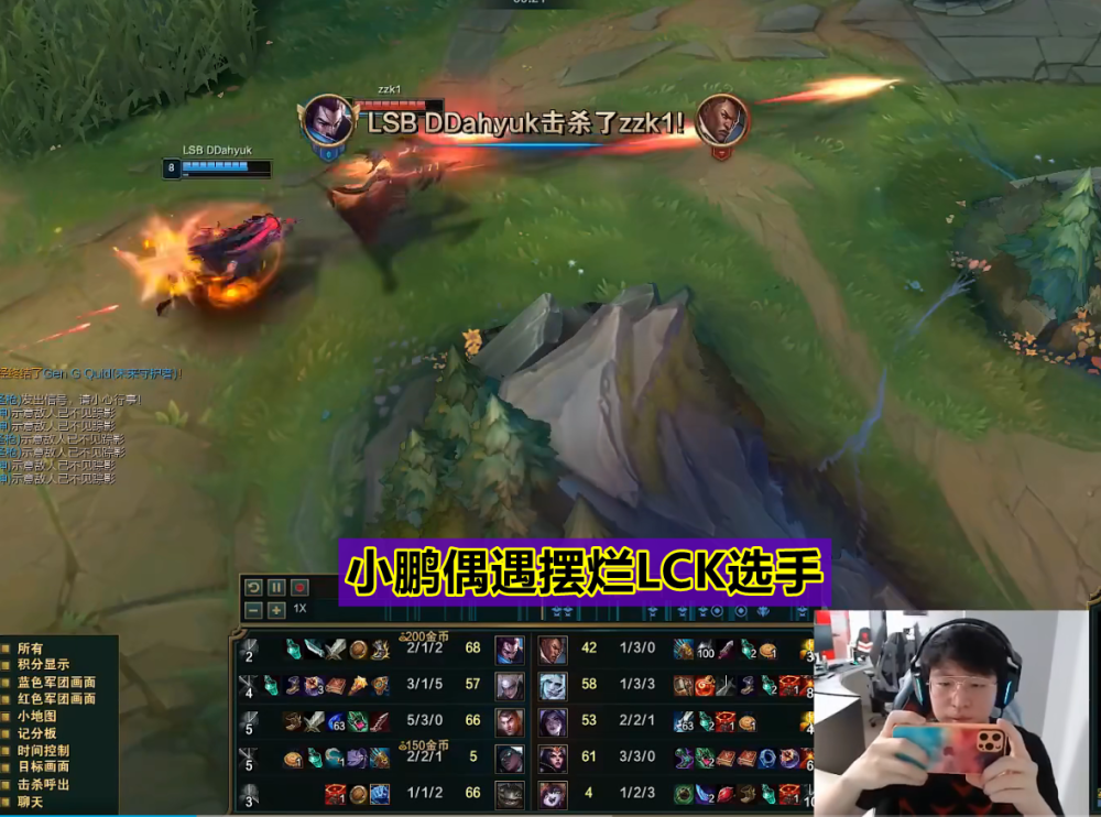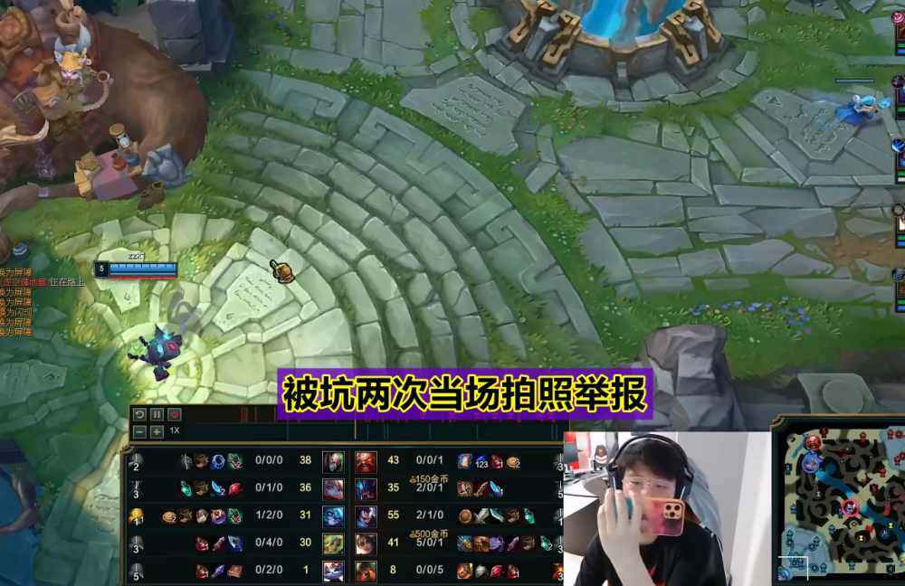 第二局又用出了薇古丝中单,果不其然中路被单杀之后,干脆站在泉水里面不动了,似乎是想要动一下,以免被系统警告,随后走到了高地塔面前发展。这两波之后,小鹏也是彻底被惹毛了,一查战绩才得知这是LCK的一名选手,果断掏出手机就来了一个拍照举报正义执法。