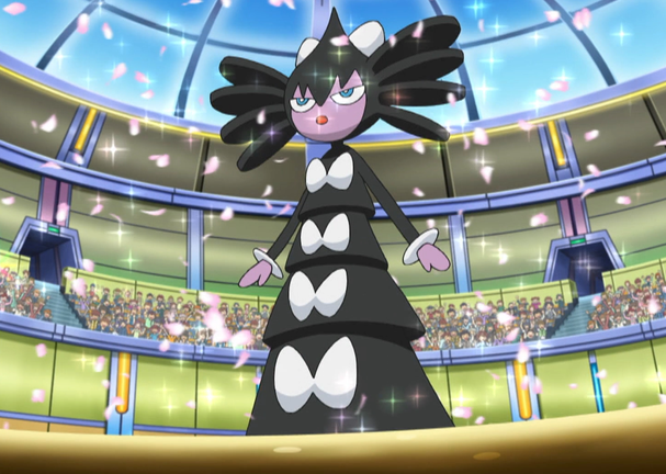 而嘉德丽雅的代表宝可梦则是哥德小姐,哥德小姐比较典型的玩法就是踩影留人,双打中可以凭借这个留人特性来配合队友,而单打则在踩到对方的时候要兼任把对方给打下场,不然的话踩影的意义就不大了,可惜的就是嘉德丽雅的哥德小姐特性一直都是察觉,大大减弱了其原来该有的能力,其配招有精神强念+暗影球+十万伏特+吹捧。