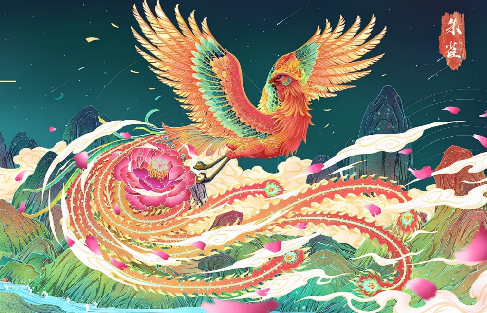 朱雀相信小伙伴们是更为熟悉,朱雀同白虎、青龙、玄武处于天之四灵,也是四象之一,在五行中代表火,朱雀也与中国古代的太阳崇拜有一定的关联,其形象类似于西方神话中的不死鸟菲尼克斯,都有着通红色的羽毛,且可以驭火飞行,在中国,朱雀常作为图腾或者的雕塑、壁画等元素出现在人们的方方面面,风水、问卦等传统民俗也常与其产生联系,而朱雀则来源于二十八宿的南方七宿(上图为朱雀的形象图)。