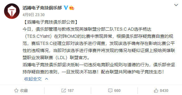 这支战队便是TES的二队,涉及到的选手便是TES二队的AD,事情的起因并非和LGD中单一般,被人爆料举报,而是在前不久对阵OMG二队的比赛中,这位AD选手给人的赛场表现非常奇怪,甚至可以说是明着送,就连当时观看比赛的观众也发觉到了不对劲,也是在巨大的舆论压力下,TES更博官宣开启了自查。