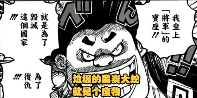 大蛇能拿得出手的手下,其实也就是狂死郎和忍者,基本上没有其他人,换言之,黑炭大蛇仅仅只是一个傀儡,真正幕后皇帝其实还是凯多。