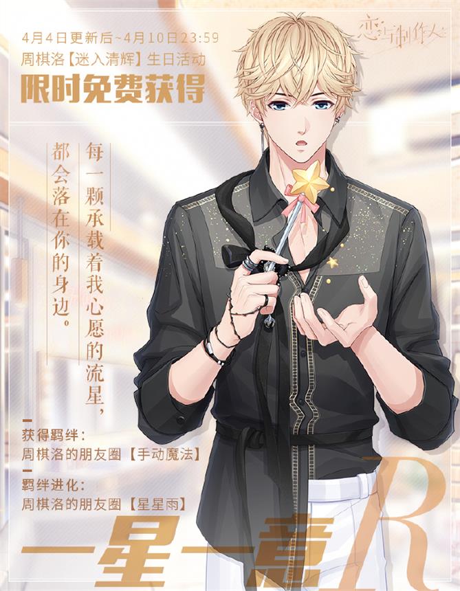 4月9日,超人气乙女手游《恋与制作人》男主角之一,超级巨星周棋洛迎来了他与制作人一起庆祝的第五个生日。游戏内,2022年周棋洛生日庆典活动正火热进行中,更有生日纪念羁绊免费获取,夜星烁烁,铺展出与他在一起的心绪轨迹。游戏外也有玩家自发举行的庆生活动,爱心公益计划、广场大屏、以及生日同人贺曲等,手心中的星星相映,串连出彼此心中从未黯淡的清辉。