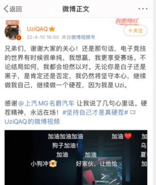 Uzi这波发文主要是有广告商找到他,不过小狗也趁机说出了一些心里话,Uzi称想赢但是更享受赛场,无论结局如何都会坦然以对,还表示要做自己,继续做一个硬茬,这里面的结局应该说的是成绩,他想拿世界赛冠军是众所周知的一件事,不过难度很大不一定能成功,Uzi对此已经做好接受失败的准备了,至于继续做一个硬茬就是宣言了,之前Uzi所在的队伍都是以下路为核心,这次BLG应该还是会以下路为核心重建。