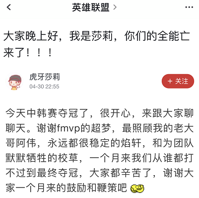 昨天中韩对抗赛落下帷幕,莎莉、小超梦、阿伟、焰轩和校草拿到了总决赛的冠军。夺冠后没多久,莎莉便某论坛上发帖,感谢各位网友的支持。