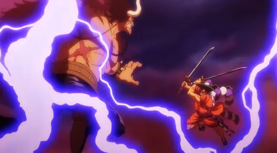 当然,御田的这次攻击虽然砍伤了凯多,但是凯多也没有失去战斗力,最终,人形态的凯多拿着狼牙棒,光月御田拿着双刀,两人准备正面决一胜负。而在这个关键时候,旁边传来了桃之助的求救声,御田因为桃之助分心所以被凯多一击给打倒了。