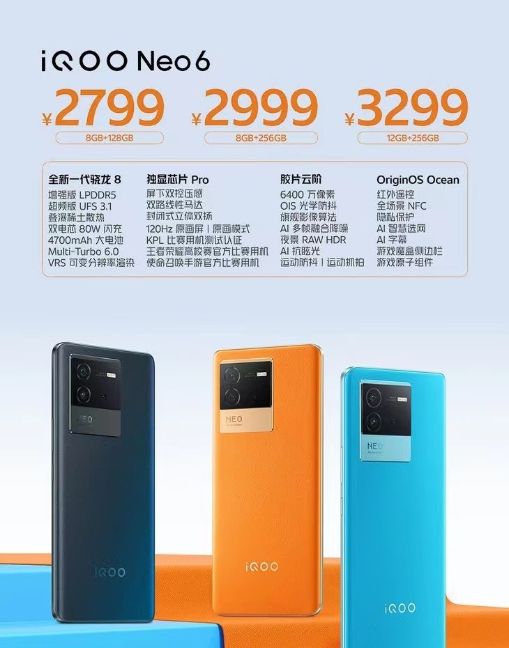另外,iQOO Neo6系列的机身有两种材质,红色和蓝色都是素皮的,黑色是AG玻璃的,重量约为197g/193.95g,厚度为8.5mm/8.885mm。比较值得一提的就是这款手机的价格,iQOO Neo6 8+128GB的价格为2799元,8+256GB的价格为2999元,12+256GB的价格为3299元。作为一款采用了骁龙8 Gen 1的机型,这个价格高了还是低了?