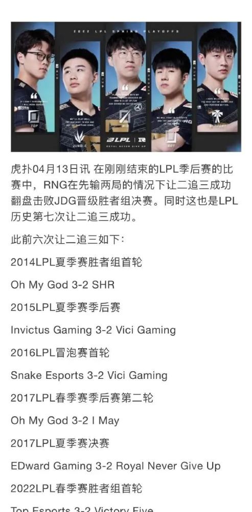 RNG战胜JDG晋级LPL季后赛胜者组决赛的同时,也是创造了LPL历史第七次让二追三,第六次则是上一场TES同V5的比赛。可见,今年的LPL季后赛着实精彩。
