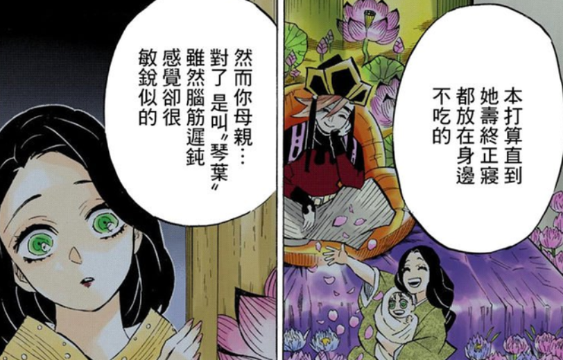 第七位,伊之助的妈妈琴叶,伊之助的盛世容颜也就是遗传他的母亲,她琴叶是一个人生充满不幸的人,先是嫁到人渣家庭,每日都在遭受毒打,掏出来后遇到童磨,原本她的美丽让得童磨都打算就这么养她一辈子,但她却是发现了童磨吃人这件事,最后童磨也不得已把她给吃掉。