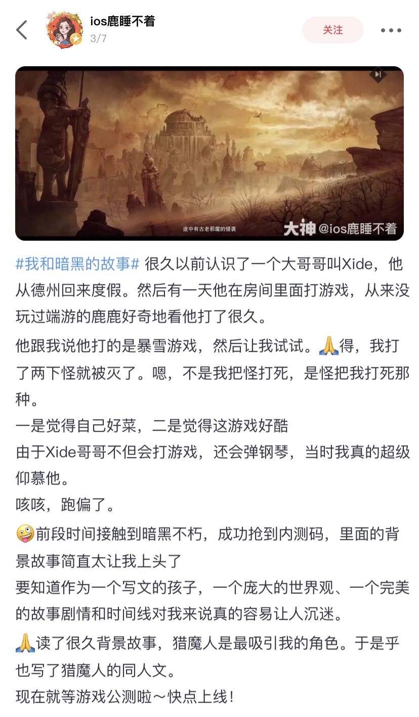 玩家“ios鹿睡不着”因优秀的大哥哥与《暗黑破坏神:不朽》结下不解之缘,游戏背景与角色一直在深深影响着她。
