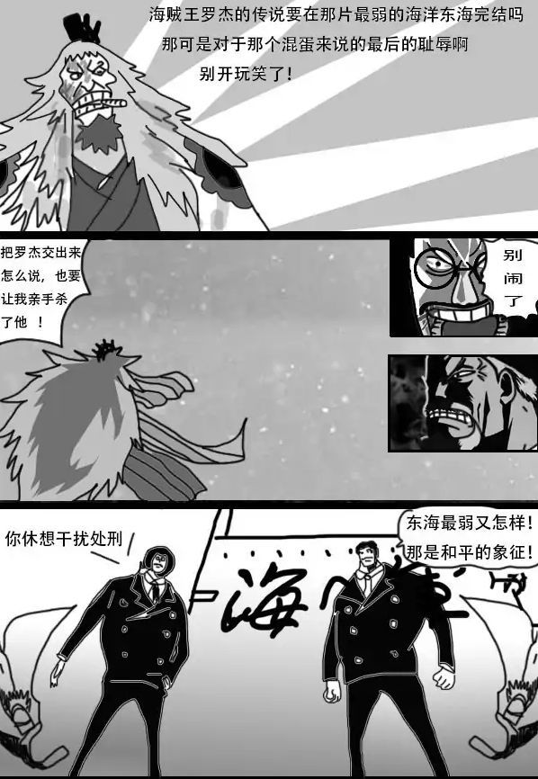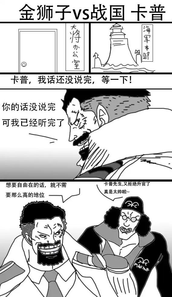 众所周知,“海贼王”贴吧一向是一个神奇的存在,这里总是汇聚着各种大神,他们可以画出精妙绝伦的《海贼王》同人漫画。而在最近,有“海贼王”贴吧的大神画出金狮子大战卡普和战国的场景,我们不妨一起来看看吧。尽管该位海迷的绘画水平有限,但其脑洞新颖,还是值得我们观看的。漫画的开头,是青雉正在夸赞卡普,因为战功赫赫,又一次晋升海军元帅,但卡普却为了自由,而再一次放弃海军元帅的位置。在青雉和卡普快乐地交谈时,金狮子单枪匹马地来到海军总部,准备救出罗杰。
