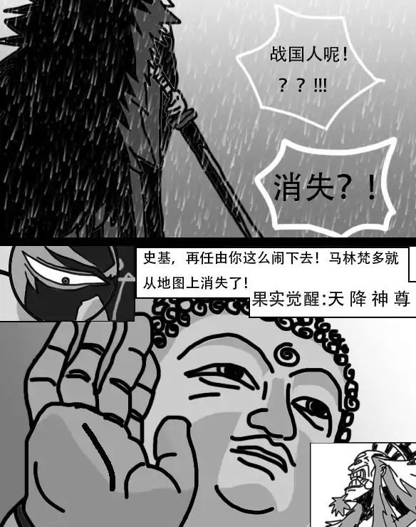在岛屿被卡普摧毁干净时,金狮子才恍然大悟,突然发现战国不见了。就在金狮子疑惑时,战国为了阻止金狮子更疯狂的行动,而使用恶魔果实觉醒的能力“天降神尊”,来制裁金狮子。在天空中,一只巨大的手指正在缓缓降下,金狮子也感到莫名的心慌意乱,而卡普则因为熟悉战国,不经感叹道,战国那家伙,又乱来了。