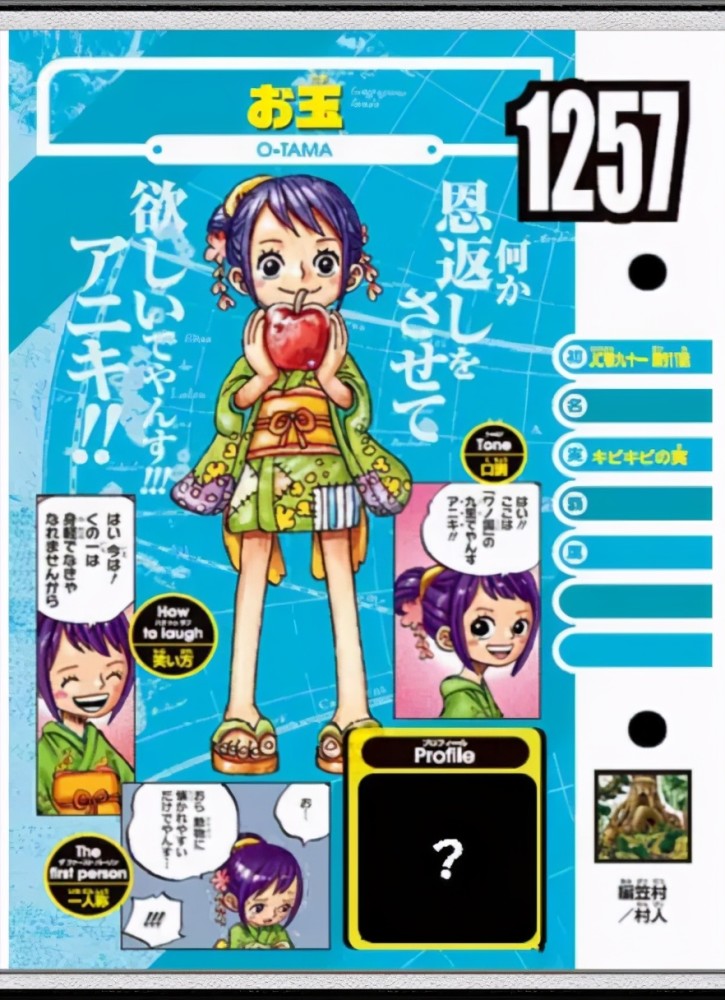 而在最新系列的生命卡中,小玉的信息算得上是得到了第一次的披露,第一个值得我们关注的就是小玉的恶魔果实,图透显示小玉的恶魔果实确定,叫做“キビキビ”,翻译过来就是“团子果实”或者“团团果实”这类的名称。