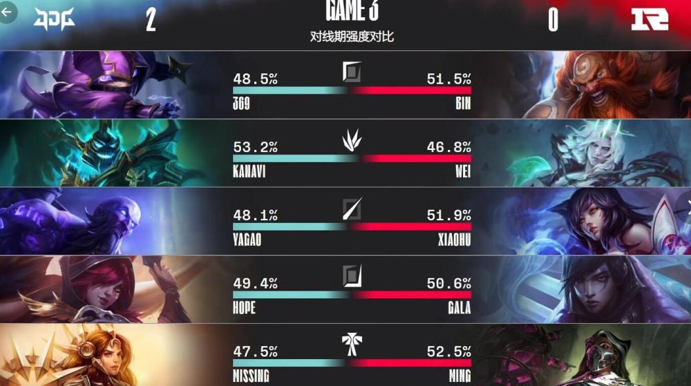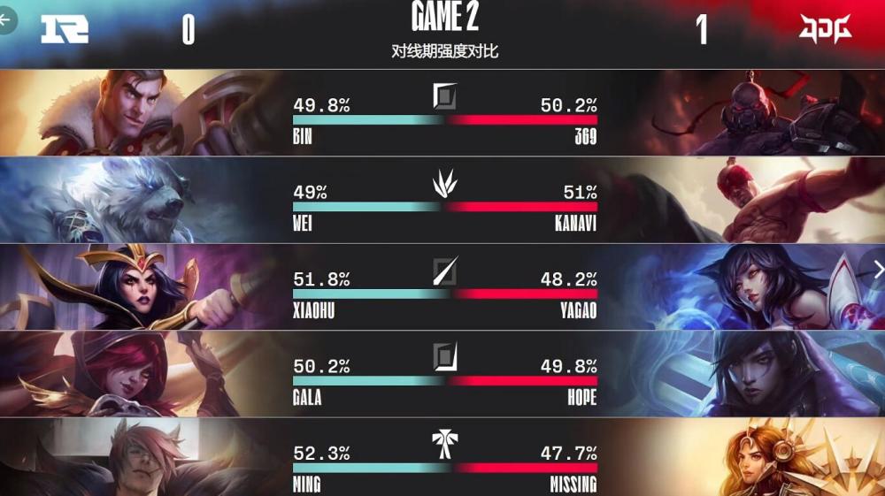 第一局比赛一开始,RNG战队在对线期经济本来处于领先,而且上中位置都打出了不错的对位领先。但是在20分钟小龙团的时候,却被JDG抓住地形优势打出1换4,顺带收掉大龙完成翻盘,最终在34分钟小龙团战时,JDG再度一波团灭RNG拿下首局比赛。