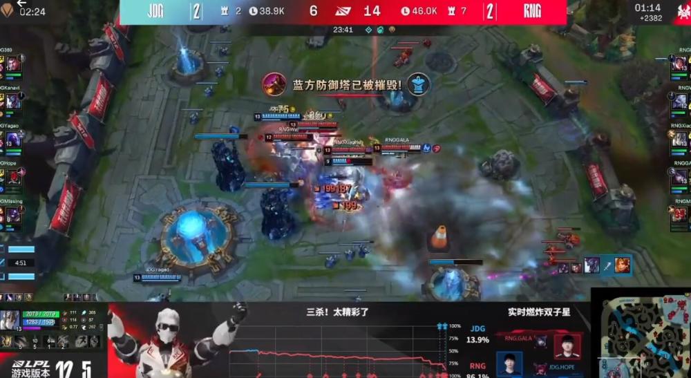 第五局决胜局,比赛一开始对线期RNG就完美发挥,在20分钟通过小规模团战打出3000经济优势,在关键的第三条小龙争夺上,RNG打出1换3拿下大龙奠定胜局,让二追三晋级半决赛。
