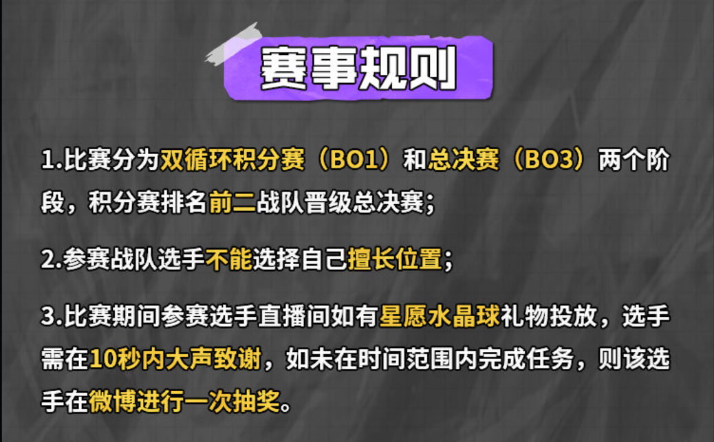 为了最大限度让选手和解说们融入自己新角色,本次比赛将参照OPL正式赛同样分为双循环积分赛和总决赛两个阶段,但双循环阶段为BO1,总决赛阶段为BO3,积分赛排名前二战队晋级总决赛。