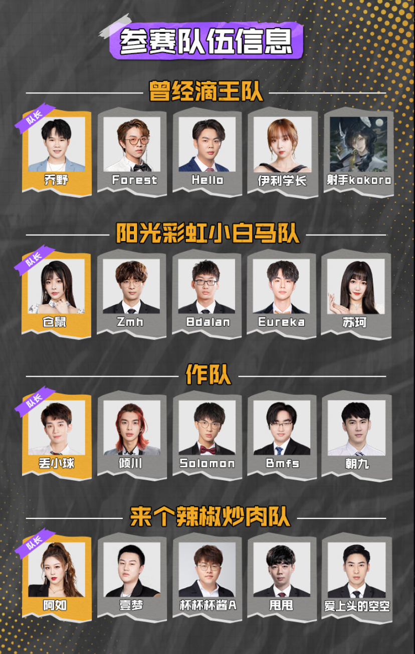 本次比赛共有四支战队参赛,每队队长均为OPL现役解说,战队选手则从解说、主持、选手和主播中挑选,但战队选手不得选择自己擅长位置,队长的实力会是绝对的胜负手,究竟哪位OPL解说会最先手乱呢?