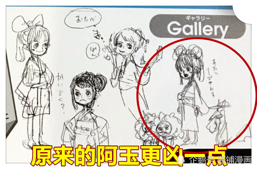 在设定的和之国原稿中,阿玉本来性格是比较凶一点的,不过到漫画正篇中就可爱了很多。原本漫画设定里,她还有猴子,狗,雉 鸡 三个宠物,后续这个设定被作者尾田取消了。