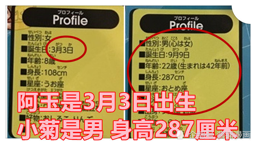 与阿玉一同公布的生命卡补充设定的还有不少人,亮点是小菊,职业是茶屋看板娘。性别一栏是男性,作者特备注明内心是女,因为是以藏的弟弟,全名叫【残雪菊之丞】,岁数是22岁,出生在42年前,生日是9月9日,身高达到287厘米,出生地是【铃 后】,喜欢魔芋丝。