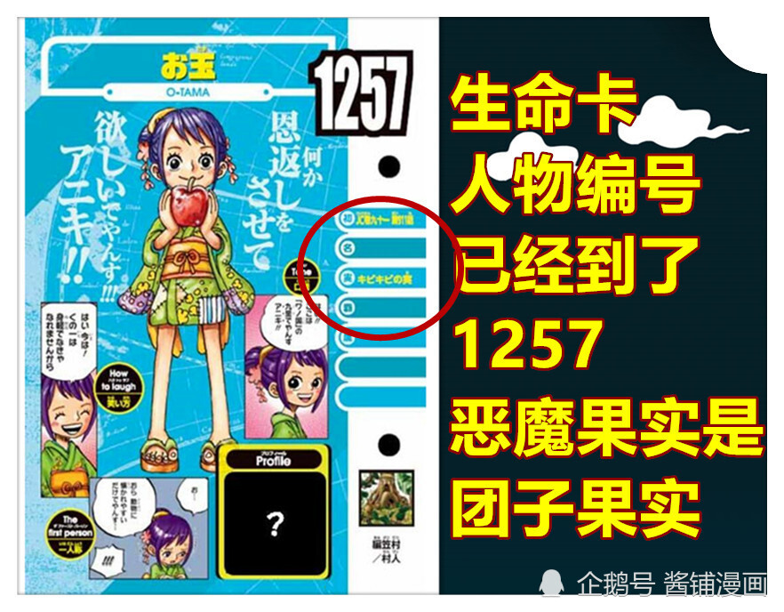 这次公布的角色,有可爱的阿玉。从阿玉的生命卡中能知晓的是,阿玉编号已经到1257号,尾田创造的漫画角色的人数众多。