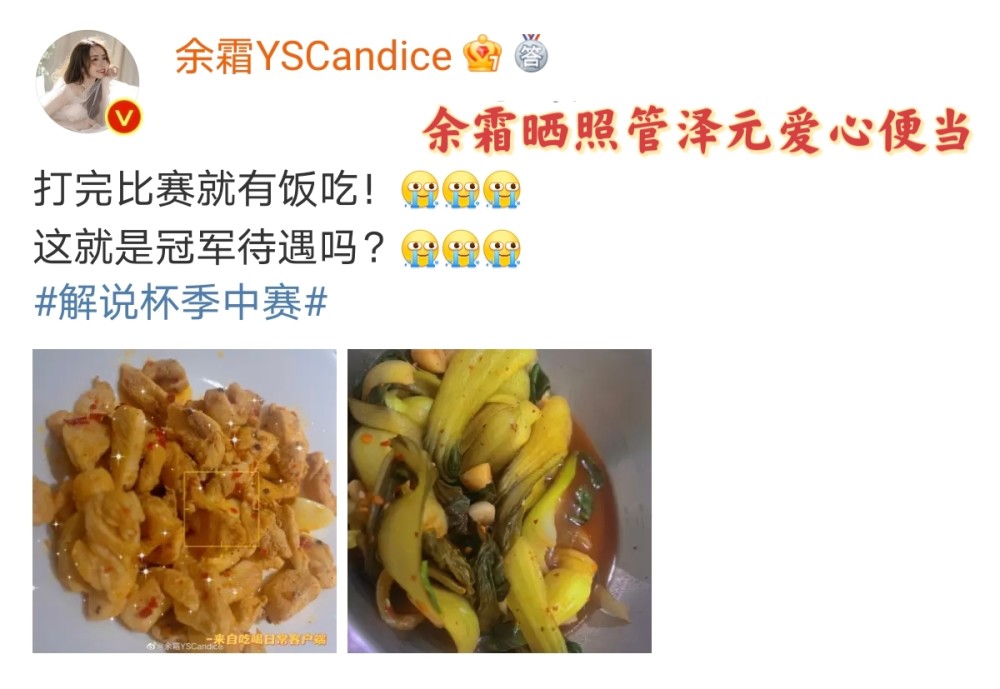 在这次的LPL解说杯结束后,余霜可能是比较高兴的原因,晒出了两道菜,表示打完比赛就有饭吃,还调侃地反问这就是冠军的待遇吗?不言而喻应该是管泽元为余霜准备了饭菜。随后在直播中面对粉丝的追问,余霜索性也就大方承认了,表示好久没吃过他做的饭了,平时都是我做饭,今天他给我做饭,这真是太阳打西边出来了!而余霜口中的“他”自然也就是管泽元了。