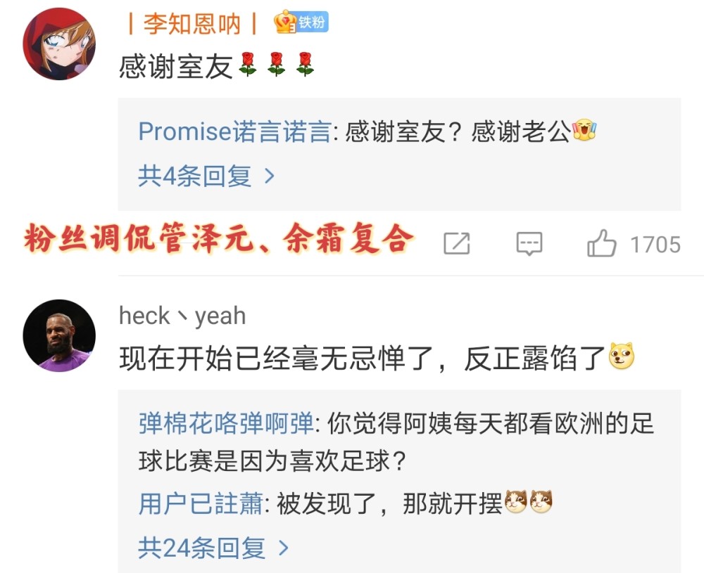此前关于两人复合的迹象有很多,首先是两人复合后不久意外出现的同框手机壳,小细节上让大家猜测两人复合,而后在余霜直播的过程中,粉丝发现余霜的直播背景似乎是管泽元家中,毕竟两人此前多次秀恩爱,粉丝们对管泽元家中的布置也比较熟悉,所以两个小迹象让大家激动了起来,毕竟粉丝们都希望两人有个好的结果。