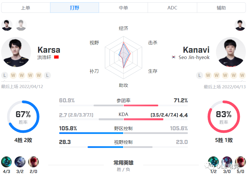 Kanavi在上个BO5里也是呈现高开低走的态势,尤其是在盲僧被BAN的情况下,他在后面三局的打得比较被动,尤其是节奏衔接与前两局简直是天差地别,优势局的心态调整也有明显的问题,在关键节点上容易出现放松的情况。另外,Kanavi的拼惩能力也有待提升,从WBG到RNG,他在这两个BO5里的惩戒水准是被对位领先的。