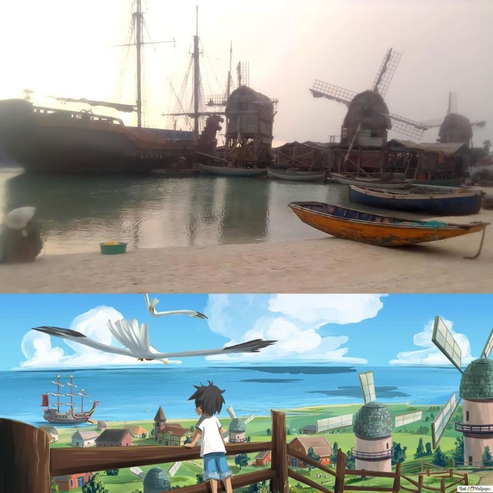 首先,由于《海贼王》真人版的故事主要围绕着“东海篇”,所以其中涉及到的场景和人物都是正片中东海篇所登场的。本次官方更新的场景照中包含路飞的出生地风车村。从更新的图片来看,跟原作中的风车村十分贴合,就连红发团贴靠在海边的画面都还原出来,不得不说这次导演组有心了。