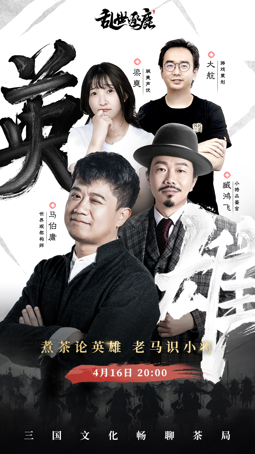 明晚(4月16日)8点,大航策划诚邀《乱世逐鹿》世界观架构师、知名作家马伯庸,脱口秀与摇滚音乐达人的臧鸿飞老师,游戏角色“关银屏”的配音老师梁爽一起煮茶论英雄,畅谈三国历史中小将背后的故事。