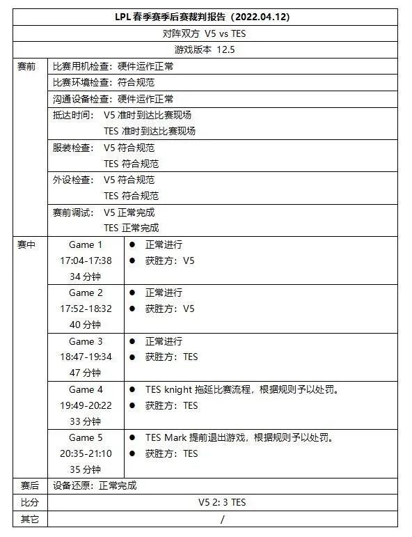 先是V5与TES的比赛,在第四局比赛中,TES战队的中单Knight选手存在故意拖延比赛进程的情况,根据规则进行处罚,而在第五局比赛中,TES战队的辅助选手Mark出现了提前退出游戏的情况,根据规则进行了触发。