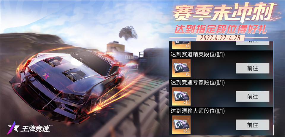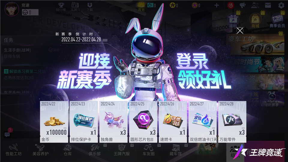 而在赛季冲刺的高潮中S8赛季也日益临近,新赛季将至,怎能没有珍贵好礼?4月22至28日,车手每日登录均可领取迎新贺礼,海量金币、排位保护卡、芯片礼包、万能零件等皆在奖励之列。