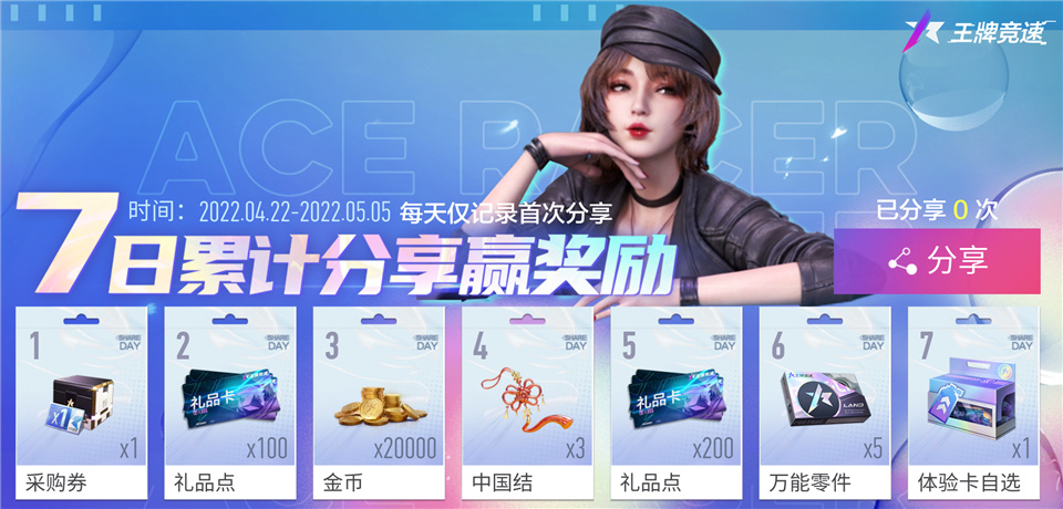 车手们在王牌速度节上的英姿,应当让更多人看到——4月22至28日,七日累计分享赢奖励活动将惊喜上线,活动期间累计分享天数越多,奖励便越丰厚,七重奖励等你一一解锁。