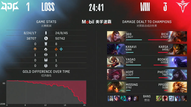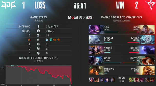在先锋团时,369凯南完美位置入场,一电四,却被Rookie瑞兹换的虚弱完美应对,这也是全程比赛中,JDG最有机会挽回劣势的一波团战。但是没有办法,卡哥的破败王太肥了,直接帮助队伍拿下第三把比赛的胜利,比分来到2:1。