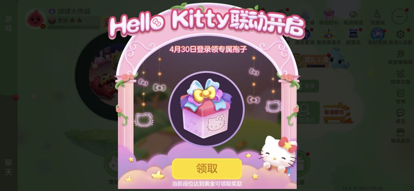 为了庆祝联动活动开启,Hello Kitty为球宝们准备了小礼物!4月30日登录游戏,同时段位达到黄金即可领取联动限定孢子、超大奇妙宝箱钥匙等惊喜好礼。