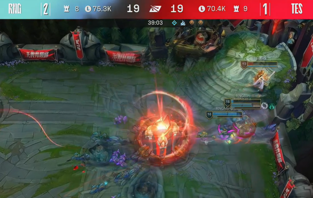 决胜团战在38分钟到来,TES派出两位队员进攻RNG中路水晶,其余三人Rush远古巨龙,没曾想两边被RNG各个击破,后者打出一波0换4,就此终结比赛,顽强的RNG实现让一追三,淘汰TES闯入决赛。