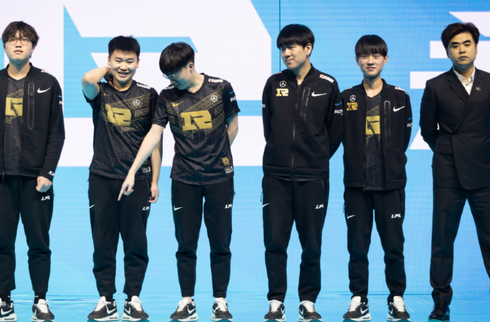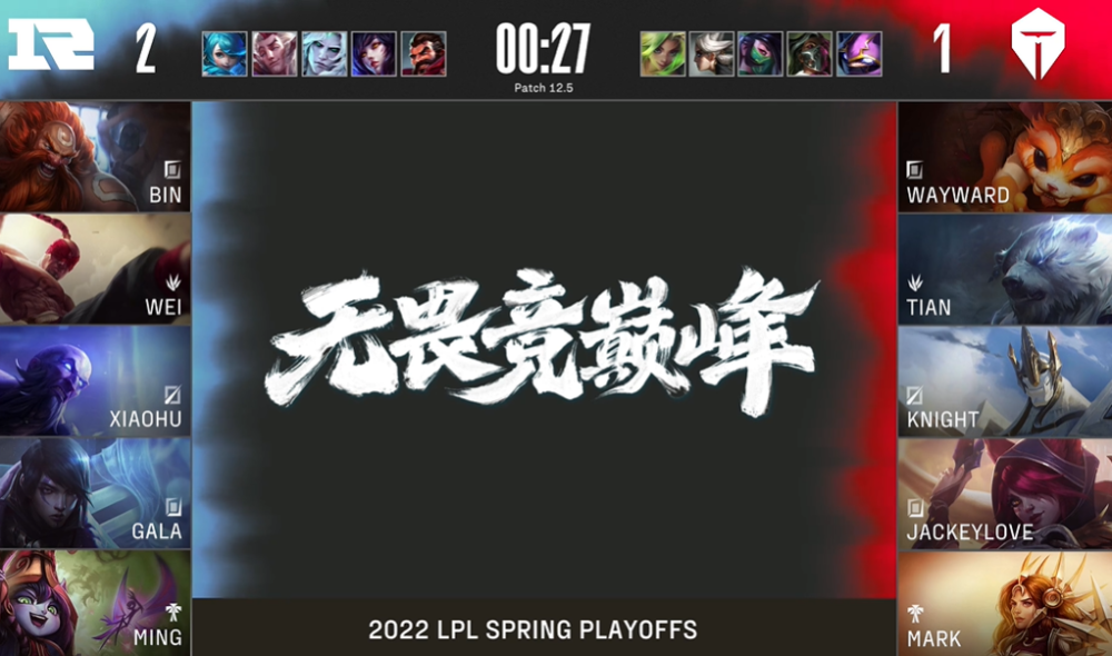 在RNG的首个赛点局,RNG启用四保一体系,Gala拿到后期强势英雄厄斐琉斯与Ming璐璐走下路,Jackeylove和Mark用霞+蕾欧娜应对,Xiaohu使用瑞兹对抗Knight加里奥,Wei再次选出盲僧与Tian狗熊交手,阿Bin酒桶、小将Wayward纳尔走上路。