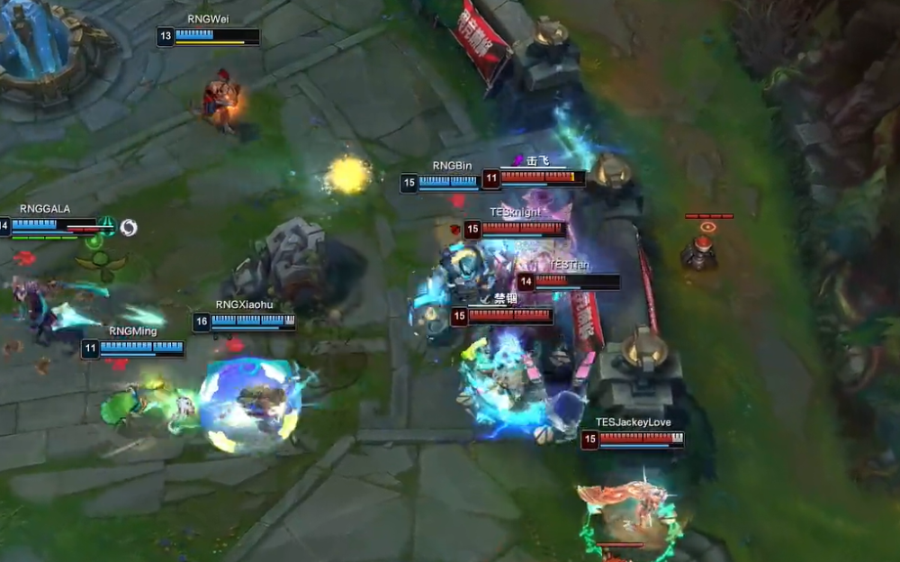 接下来TES全员进攻RNG高地,Knight加里奥配合队友进场,想要秒杀RNG主力C位Gala厄斐琉斯,没曾想后者力挽狂澜,不只丝血逃生,还打出满额AOE,帮助队伍击杀TES三人,Jackeylove霞推塔节奏中断,RNG得到了喘息的机会。