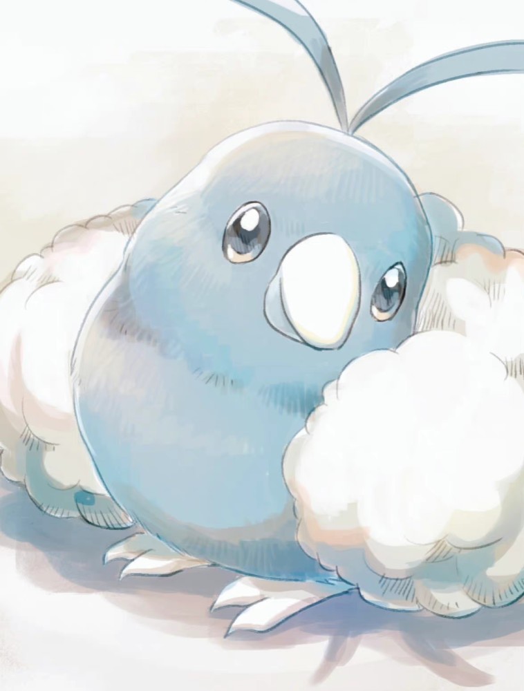 青绵鸟,丰缘地区的一般和飞行属性的萌萌哒,是非常爱干净的宝可梦,看到不干净的东西就会用棉花般的翅膀清理,翅膀脏了的话就会去河里冲洗干净。