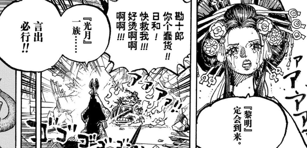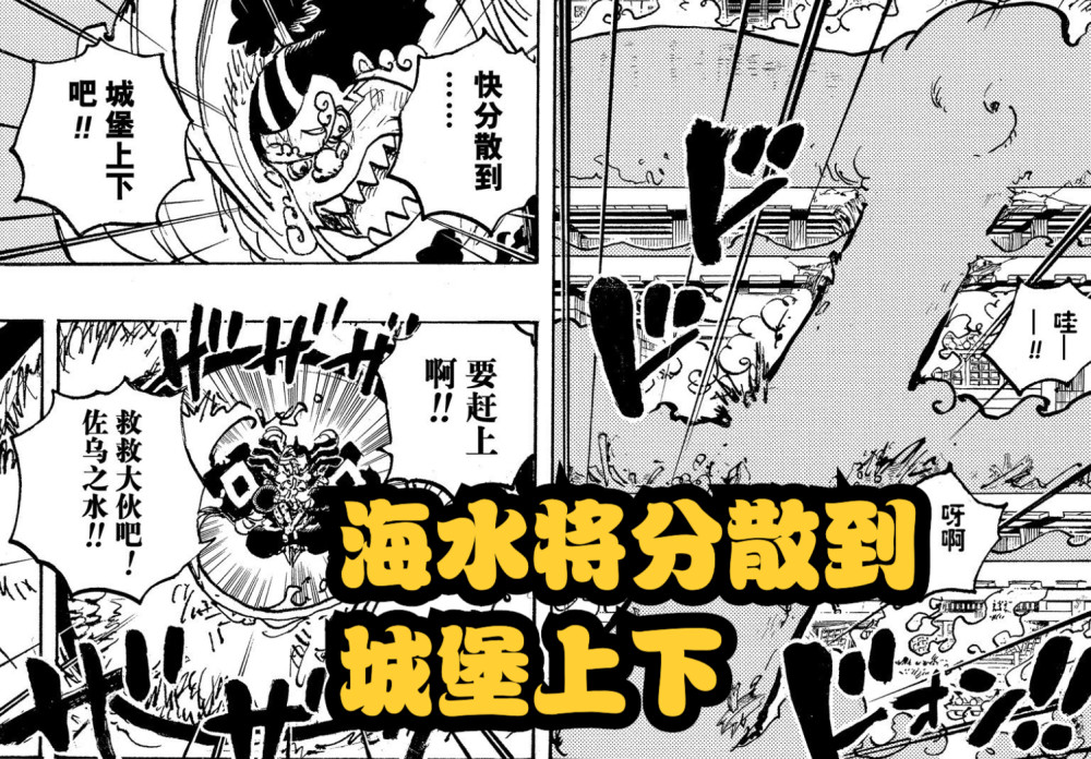 1046话的看点虽然不多,但尾田为了解救困在鬼岛熊熊大火的民众们,不得不安排雷藏这位拥有【卷卷果实】的忍者施展准备许久的【水遁之术】,将大量海水释放出来,配合甚平的鱼人空手道,散布到各个区域,扑灭所有火势。