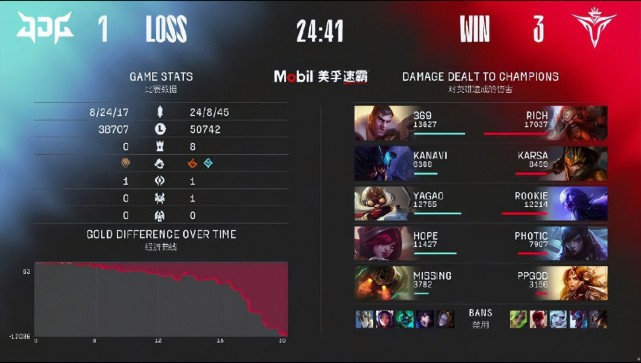最后一场小局中,369可以说非常悲惨,Kanavi一直不能来帮其建立优势,而后对手还无情针对369,加上369本身就祭出了需要线上优势的杰斯,一前一后,369因为对线期的针对,中后期完全打不出杰斯该有的效果。虽然说被针对能多少给369洗点,但毕竟战绩非常惨痛,被针对无法帮369洗白。
