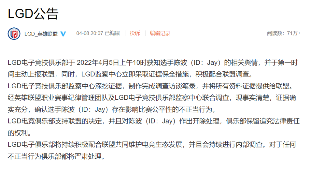4月8日,英雄联盟赛事官方在微博宣布,Jay选手被LGD俱乐部举报涉嫌违规。经调查Jay选手假赛属实,确实存在影响LPL比赛公平性的不正当行为、并参与非法组织的有关英雄联盟赛事的投注。
