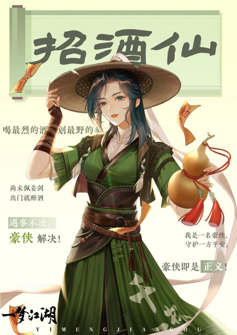 豪侠行当专属外观以竹青色为主,头戴斗笠臂缠护腕,革质腰带修饰英姿,尽显飒爽。不仅如此,豪侠的时装还分为基础款和进阶款。在基础款中,少侠们扬起的裙袂上写着“千杯不醉”,洒脱恣意,当少侠们历练成长后可以解锁进阶款外观,将“万杯不倒”的标签印在身上。