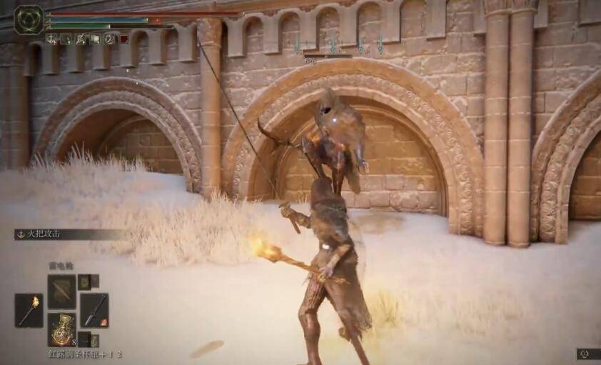 2、下到楼梯把火把点燃,点燃后会锁怪。隐身怪出现后会先甩出一个红色刀刃,注意翻滚躲避。
