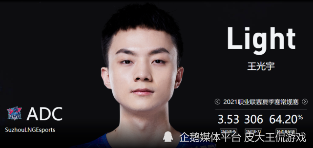 然后是LNG战队的light,LNG战队作为常规赛成绩第五的战队,成绩面板上来说还算是说得过去的,而且light在战队中的表现和发挥也是非常稳定的,除此之外,他的英雄池也是非常深,版本热门的ad也都可以拿得出手,虽然不是特别突出,但是各方面都很出色。