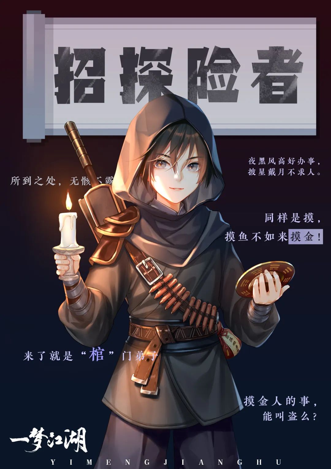 听闻各大行当都派出了行业领头人来江湖招生,觅宝司的景爷也坐不住了。来景爷处报名加入摸金行当,还有机会获得景爷亲笔所著的摸金宝典《摸金:从入门到入土》!