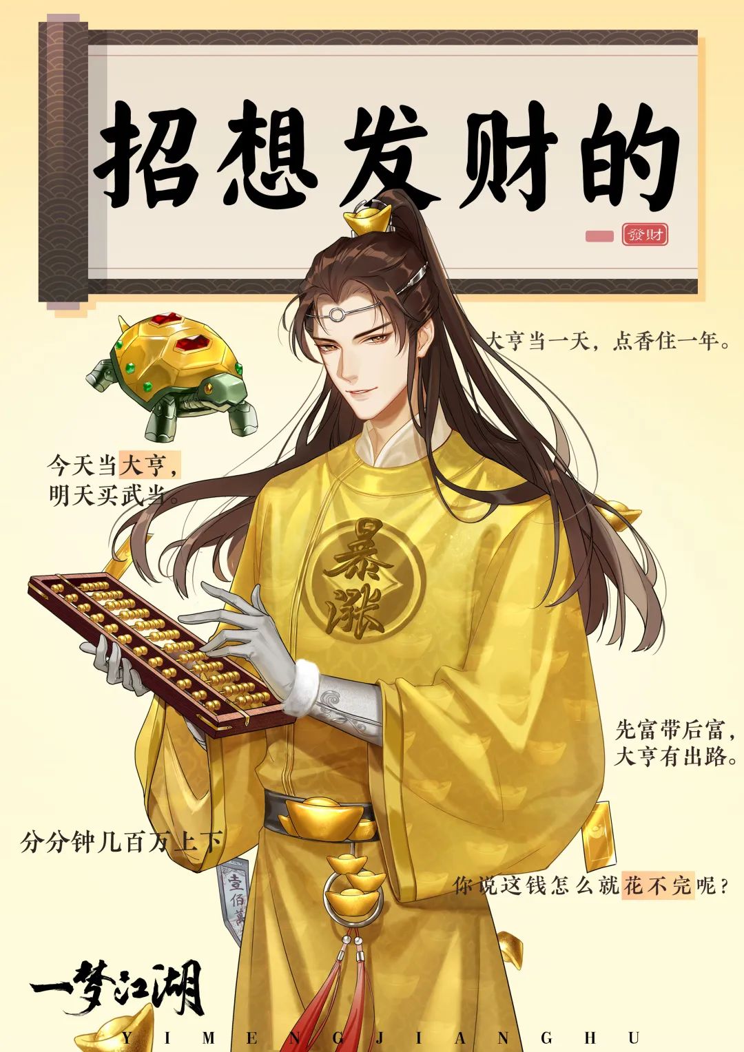 大亨每日参加江湖行商任务都能获得低级龟粮,积累一定数量的龟粮即可换购大亨专属跟宠?归归!大亨少侠每日首次摸龟都能获得奖励随机的“摸龟礼包”,其他行当的少侠每次摸龟也能获得随机幸运小buff!此外,归归每成长到相应的阶段都能解锁龟龟不同部位的外观配饰,商业巨贾的跟宠,当然也要穿金戴银,牌面十足!