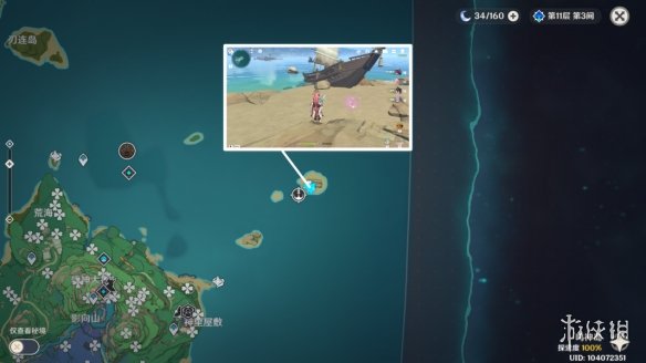 位于神里屋敷的右边的海域,需要开船过去,且就一个绯樱绣球,所以不建议去采集。