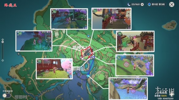 鸣神大社上面绕一圈后,注意观察最后两个点的位置。倒数第二个点的位置,是贴近山体的,在下落的过程开启元素视野,方便找寻此绯樱绣球。